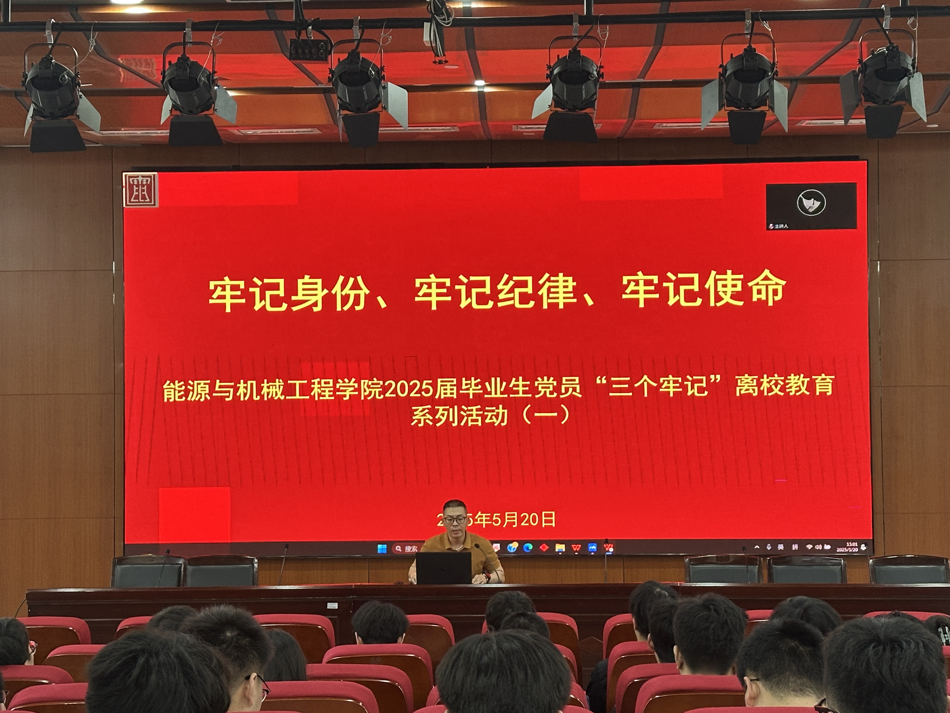能源与机械工程学院于5月20日在学术楼103会议室召开了“牢记身份、牢记纪律、牢记使命”——2025届毕业生党员“三个牢记”离校教育系列活动(一),学院全体毕业生党员参加会议。