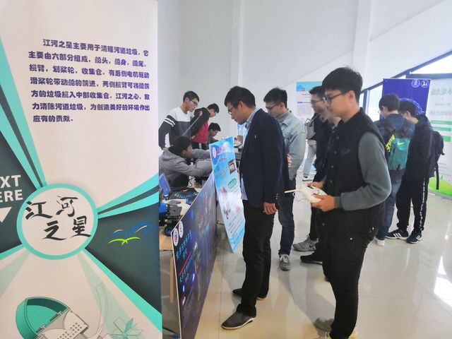 随后各学院进行科技创新成果展示,能源与机械工程学院所展示的,麦克纳姆轮小车引得在场学生驻足,河道清理型机械模型“江河之心”更引来学生的围观讨论,大学生创新创业协会副会长马泽细致的介绍两项作品的原理及用途。周长长老师莅临现场,与参加本次活动的上海市创造杯二等奖的获奖队伍进行深入交流,视频短片与动手体验相结合,周老师对本次展出作品给予了高度评价,对我们善于创新、乐于创造的同学给予了鼓励和并寄予厚望,希望我们能机学子在各项赛事中都能斩获更多佳绩,取得更大成功!