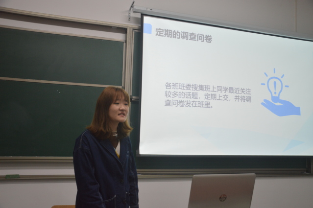 在其后的座谈会中,媒体工作部部长李冬雪同学和宣传委员们一起分享交流。首先,定期由宣传委员发放到各班并收集整理的调查问卷,目的是为了通过调查问卷的方式收集到学生们最关注的话题,从而促进媒体工作部街头采访活动更加有效地进行。然后,就是跟大家介绍了媒体工作部针对宣传委员开展的技能培训,例如新闻稿培训等。同时征求了大家想要学习的一些技能的意见和建议。
