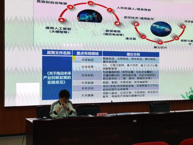 仇玮民首先对《推动未来产业创新发展的实施意见》进行了深入解读,重点分析了未来产业的重点布局领域,包括元宇宙、脑机接口、量子信息等前沿科技方向。仇老师特别结合能机学院的专业特色,介绍了新能源汽车零部件供应商领域的发展潜力,鼓励学生关注行业动态,提前做好职业规划。