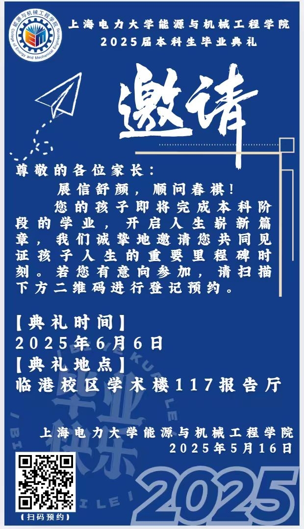 有意向参加毕业典礼的学生家长请于2025年6月3日下午17:00前扫描邀请函中的二维码进行预约登记。(临港校区停车位紧张,有开车进校需求的需提前登记,建议各位家长绿色出行。)