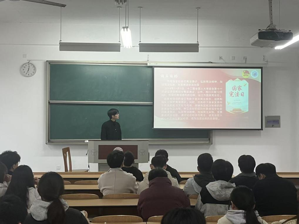 宣讲团成员深入班级,结合学院专业特色,采用“理论讲解+案例剖析+互动答疑”模式开展宣讲。活动结合宪法发展历程、宪法日确立背景及核心要义,阐释宪法对公民权利的保障机制及法治实践原则,引导同学们深入思考新时代青年在法治建设中的责任担当。