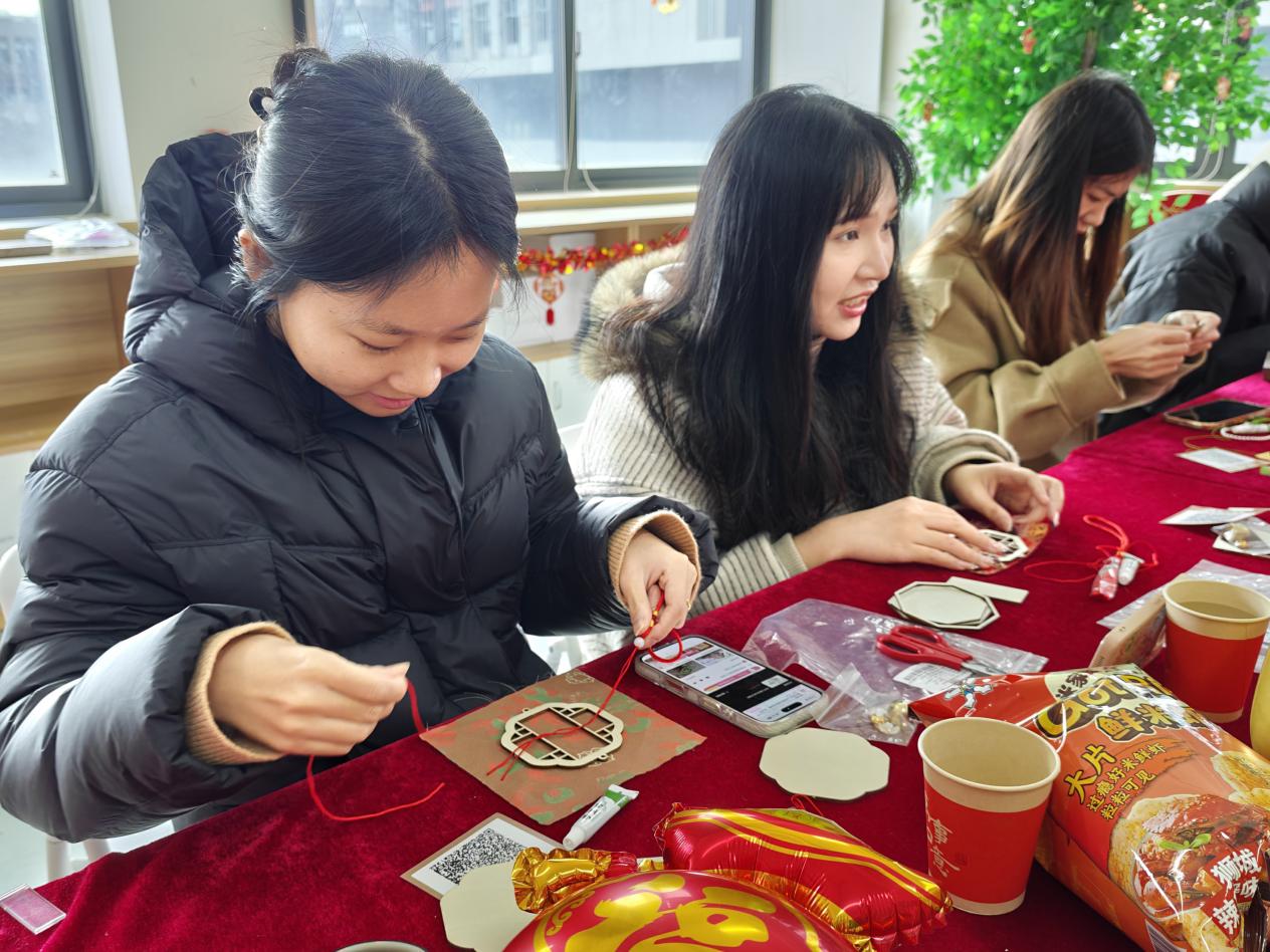 慰问座谈结束后,学院精心组织留校学生新春手工茶话会。同学们欢聚一堂,共同参与马年主题手工宋锦拼贴珍珠画、珍珠手工风铃制作。大家全身心投入手工创作,在沉浸式体验中感受传统手工艺的独特魅力,也进一步拉近了彼此的距离,增进了同窗情谊。