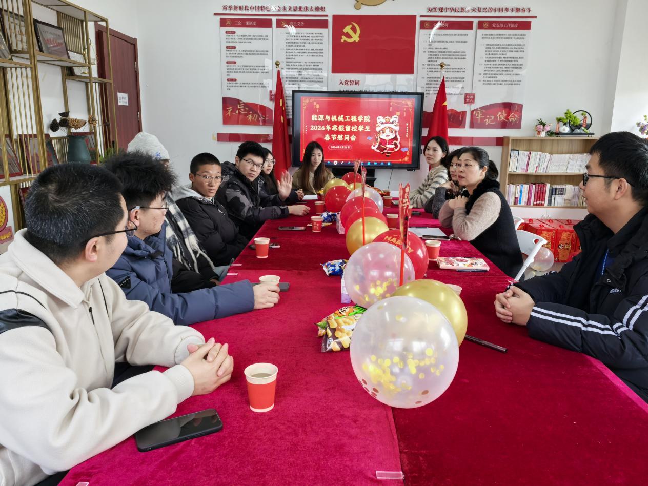 2026年1月28日,学院在能机楼322会议室举行寒假留校学生春节慰问活动。学院党委副书记涂莹亮,团委书记韩林岑,辅导员张鸿燕、高汕、刘力瑞与留校学生面对面座谈,送上节日的问候与美好祝福。