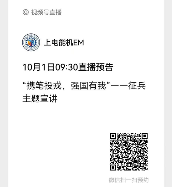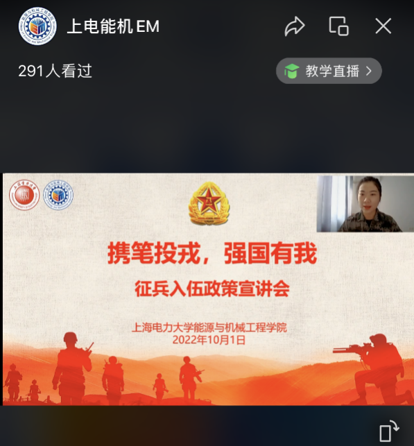 “强国必须强军,军强才能国安”。为进一步贯彻国家征兵政策,积极鼓励和引导青年学生应征入伍,10月1日上午,能源与机械工程学院依托学院微信视频号“上电能机EM”以“ 携笔投戎,强国有我”为主题进行直播互动。学院征兵工作负责人仝晶晶主讲,邀请了学校优秀退役大学生士兵进行分享,活动覆盖了学院全体新生。