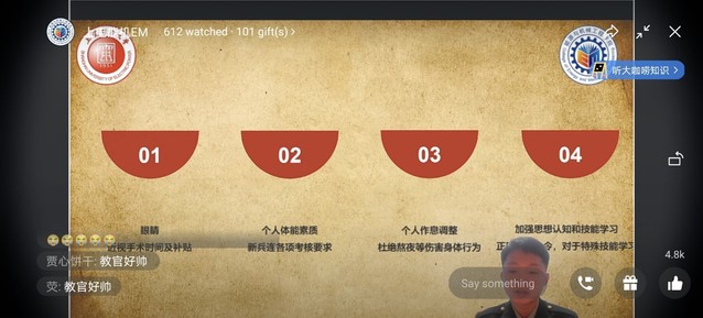 此次直播正逢国庆佳节,为庆祝中华人民共和国成立第73周年,仝晶晶为大家播放了1949年开国大典上的阅兵片段,引起同学们的深刻感慨,祖国如今的繁荣富强离不来革命先烈们的英勇奋斗和牺牲。作为一名青年人,更应该树立“强国必须强军,军强才能国安”的国防意识,为和平稳定贡献自己的一份力量。