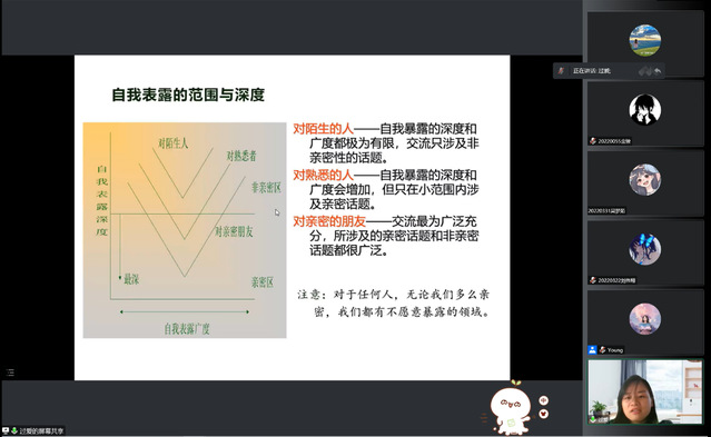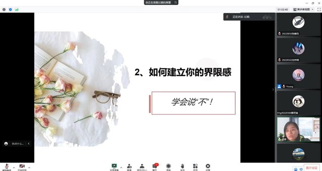 为有效引导新生优化个性心理品质、提高心理调适能力,构建良好可持续的人际交往关系,尽快完成大学生活的调整和适应,121613:30,能源与机械工程学院组织全院新生齐聚云端,开展了一场主题为“大学生的人际沟通”的专题讲座,讲座由校心理健康教育中心专职心理教师过爱主讲。