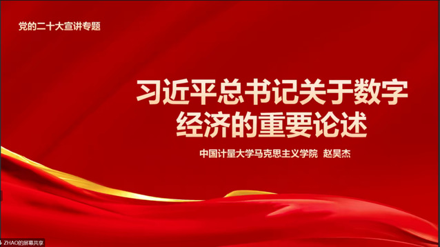 10时30分第二场是发展对象和入党积极分子共享课,由赵昊杰老师作了题为《习近平总书记关于数字经济的重要论述》的讲座。赵老师从发展脉络、数字经济与“统筹国际两个大局”、二十大报告中涉及数字经济的内容、推进数字经济发展的路径四个方面进行讲解,通过解读数字经济的发展、人民生活水平的提高,诠释了中国共产党全心全意为人民服务的宗旨。
