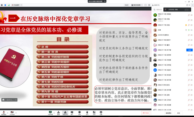 下午13时至14时30分是入党积极分子专场,由李谦老师作了题为《党章历史沿革与百年大党成功之道》的讲座。李老师从历史脉络中深化党章学习、党章的起源与发展、百年大党成功之道的党章史解答、尊崇党章做忠实的践行者四个方面,向学员们们详细阐述党章的历程以及新修订党章的内容,通过深入学习和了解党章,进一步端正学员们的入党动机。