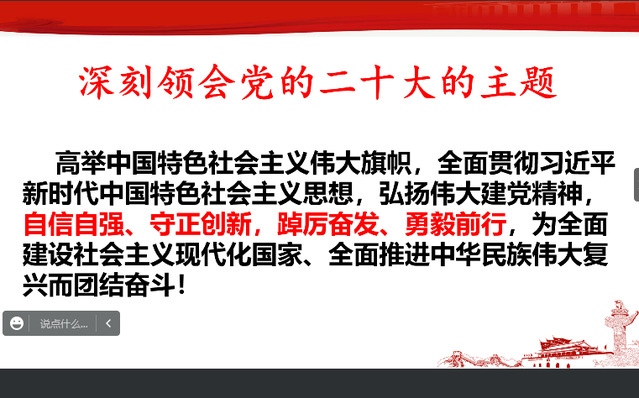 第二次集中培训分为发展对象会场和入党积极分子会场。发展对象于上午9时开始,由杨红娜老师作了题为《学习贯彻党的二十大精神,争做新时代“四有”好青年》的讲座,杨老师通过宣讲党的二十大精神,激励学员们作为新时代的接班人,要肩负起历史使命,抱有远大理想,坚定战略自信,保持战略清醒,增强信心斗志,高举中国特色社会主义伟大旗帜,奋力谱写全面建成社会主义现代化强国崭新的篇章。