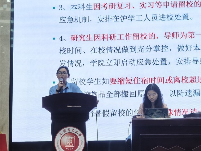 会上,周婷以“安全第一、节能减排、便于管理”为原则,就暑期留校的安排和情况进行了详细的说明,向同学们提出以下要求。第一,加强安全防范意识。在人身安全、交通安全,财产安全,饮食安全,用电安全,实验室安全等方面要多加注意。第二,加强离校报备意识。因不同原因留校的同学,长时间离校要及时和辅导员和相关负责老师报备,以便及时掌握同学们的个人安全情况。第三,充分利用暑期实践充实自我。无论是考研科创还是就业实习,同学们应该充分利用好暑期的空余时间,进行好细致的规划,以锻炼自身能力,开拓自身眼界。最后,仝晶晶就学校的食堂、教室、图书馆开放时间等为大家进行了详细介绍,以便同学们及时了解。