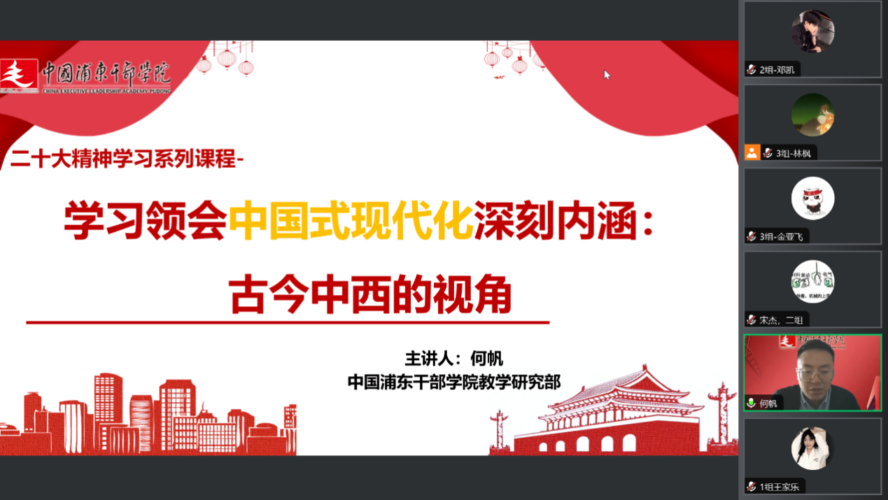 2023年10月15日能源与机械工程学院分党校举办第10期发展对象培训班第四讲。中国浦东干部学院讲师、党性教育团队成员何帆老师为此次班级培训的主讲授课老师,开展了以“党的二十大精神学习系列课程——学习领会中国式现代化深刻内涵:古今中西视角”为主题的党课培训。