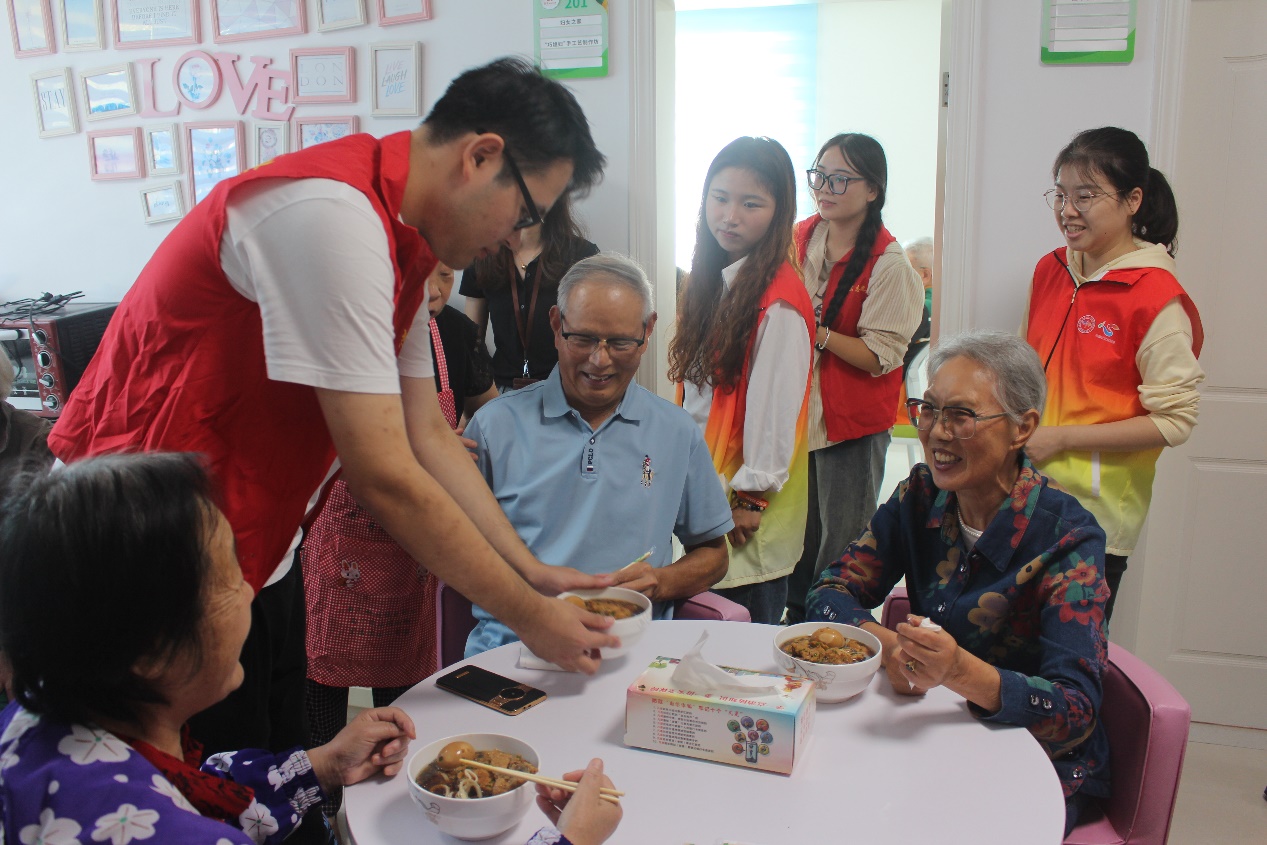 随后志愿者们端上由居委为老人们贴心准备的热气腾腾的长寿面,寓意老人们健康长寿,长长久久。一碗长寿面不仅是饮食上的呵护,对老人们情感上的关怀,让他们感受到年轻人的敬老情
