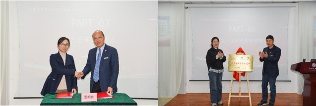 周婷与刘保林共同签署《大学生社会实践基地共建协议》,内容涵盖了生命教育、爱国主义教育、志愿者活动、日常社会实践岗位设立以及宣讲团志愿讲解指导等多方面内容。仝晶晶与陆军在全体师生代表的见证下为大学生社会实践基地揭牌。