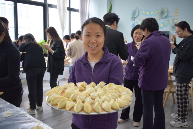 活动现场,老师们分工明确,配合默契,忙得不亦乐乎。有的老师手法娴熟地擀着饺子皮,一张张薄厚均匀的面皮在他们手中快速旋转;有的老师专注于揪面团,大小均匀的面团排列整齐;还有的老师则大显身手包着饺子馅,或捏出精致的褶子,或包出独特的形状,一排排独具个性的饺子很快摆满了餐盘,每一个饺子都饱含着老师们的欢乐与创意。整个过程中,大家相互交流包饺子的技巧,互帮互学,在协作中感受着冬日里的融融温情,现场气氛热闹非凡。