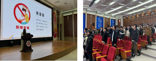 随后,全体同学在班导师和辅导员的见证下,郑重签署了诚信考试承诺书,承诺以实际行动践行诚信理念,维护考试的公平公正。在班委的带头下庄严宣誓:“自觉遵守考试纪律,认真对待期末考试,用诚信书写考卷,用实力赢得未来!”誓言铮铮,响彻教室,彰显了同学们坚守诚信的决心。