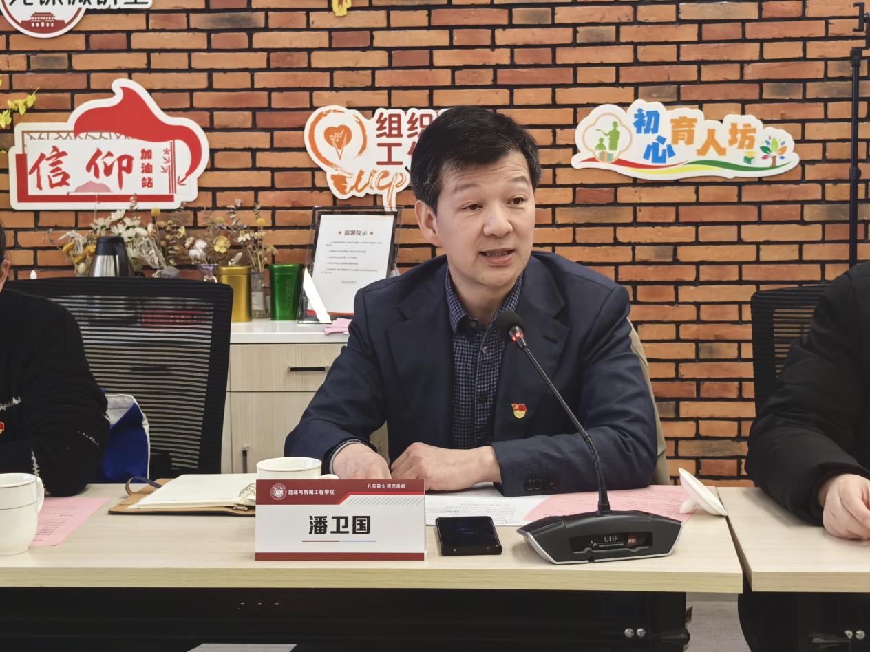 能机学院党委书记潘卫国作为主持人发表了开场词。潘老师首先对各位参会人员的到来表示热烈欢迎,并强调了此次联组学习的重要意义。他指出,当前国家正处于能源转型的关键时期,对能源科技人才的需求日益迫切,作为培养能源科技人才的重要基地,能机学院与环化学院有责任也有义务通过深化协同融合,共同推动教育科技人才一体化发展,为国家能源战略贡献智慧和力量。